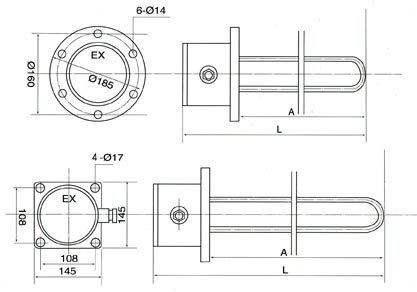 該加熱器為防爆加熱器,聯接法蘭采用圓法蘭和方法蘭的形式(方法蘭在型號后面加F),選定電壓可220V或380V,并可在接線腔內安裝溫度控制器。質量較為穩定。